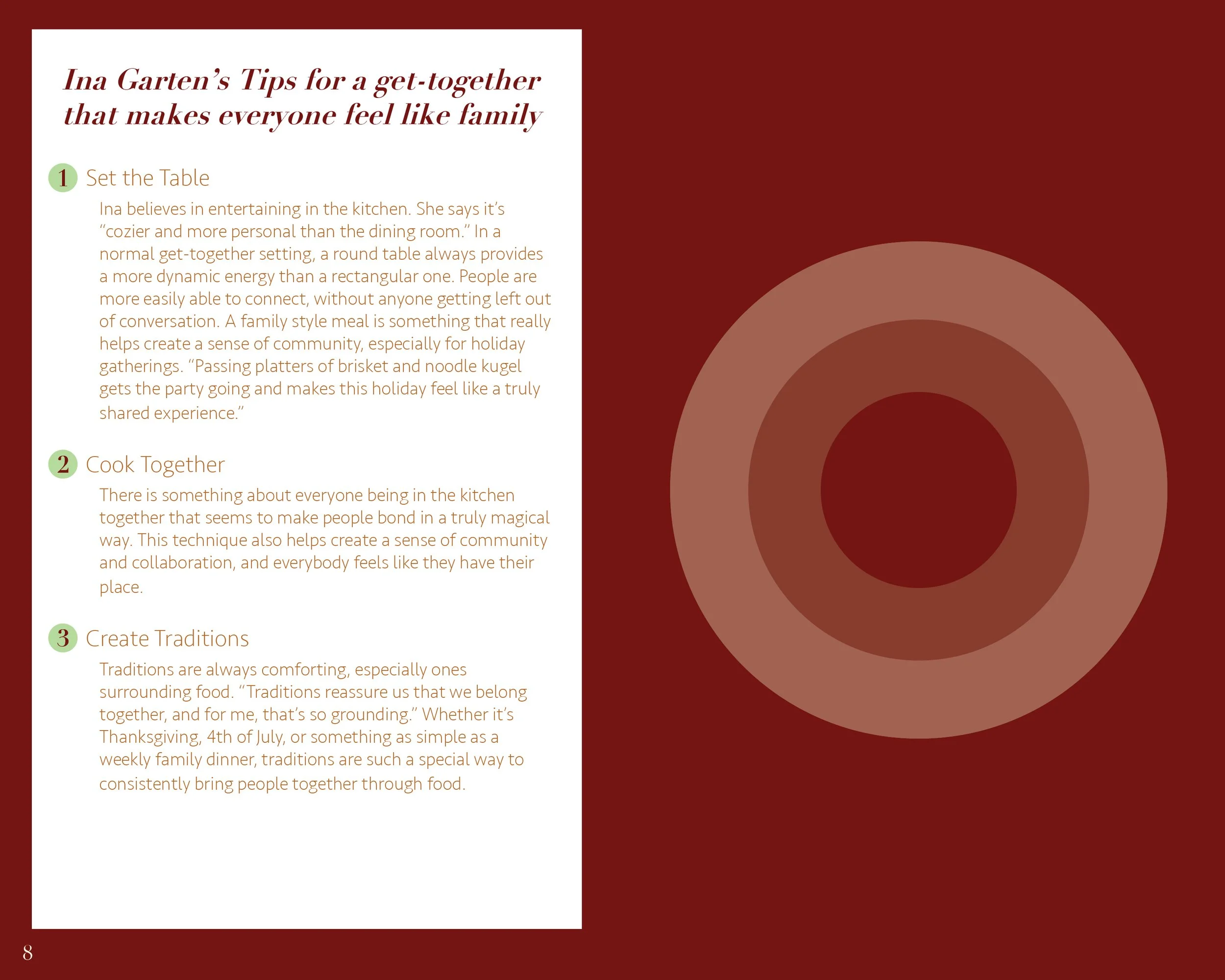 As a way to inform the visuals for the booklet, I chose one design principle and one design element. By evoking the principle of balance and the element of point, I created a sense of uniformity throughout the book that tied the information from many different sources together.