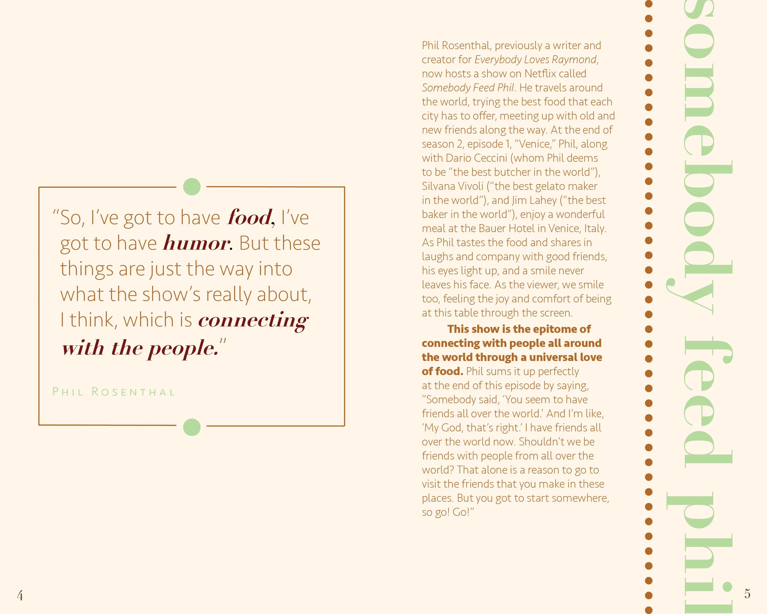 “Food for Thought” is a zine I created to highlight the ways in which food connects people around the world. I compiled articles and quotes, taking inspiration from some of my favorite chefs and TV shows–Guy Fieri, Somebody Feed Phil, and Ina Garten to name a few.