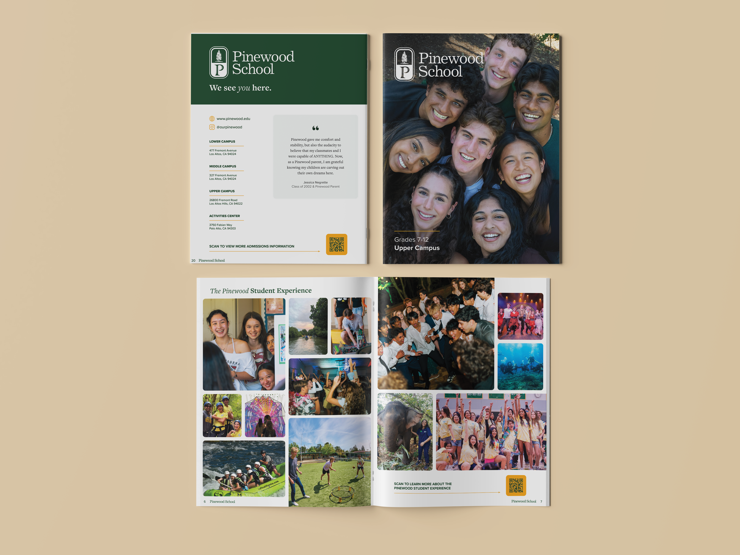 The Pinewood Viewbooks were designed as admissions catalogs for Pinewood School in Los Altos Hills. Implementing Pinewood’s updated visual identity, I was able to seamlessly coordinate these magazines with Pinewood’s website redesign. The Viewbooks showcase Pinewood students from all three of the school’s campuses in two editions: The Lower and Middle Campus Edition, and The Upper Campus Edition. As prospective students and parents browse these catalogs, they are struck by Pinewood’s emphasis of community and their culture of kindness and respect.